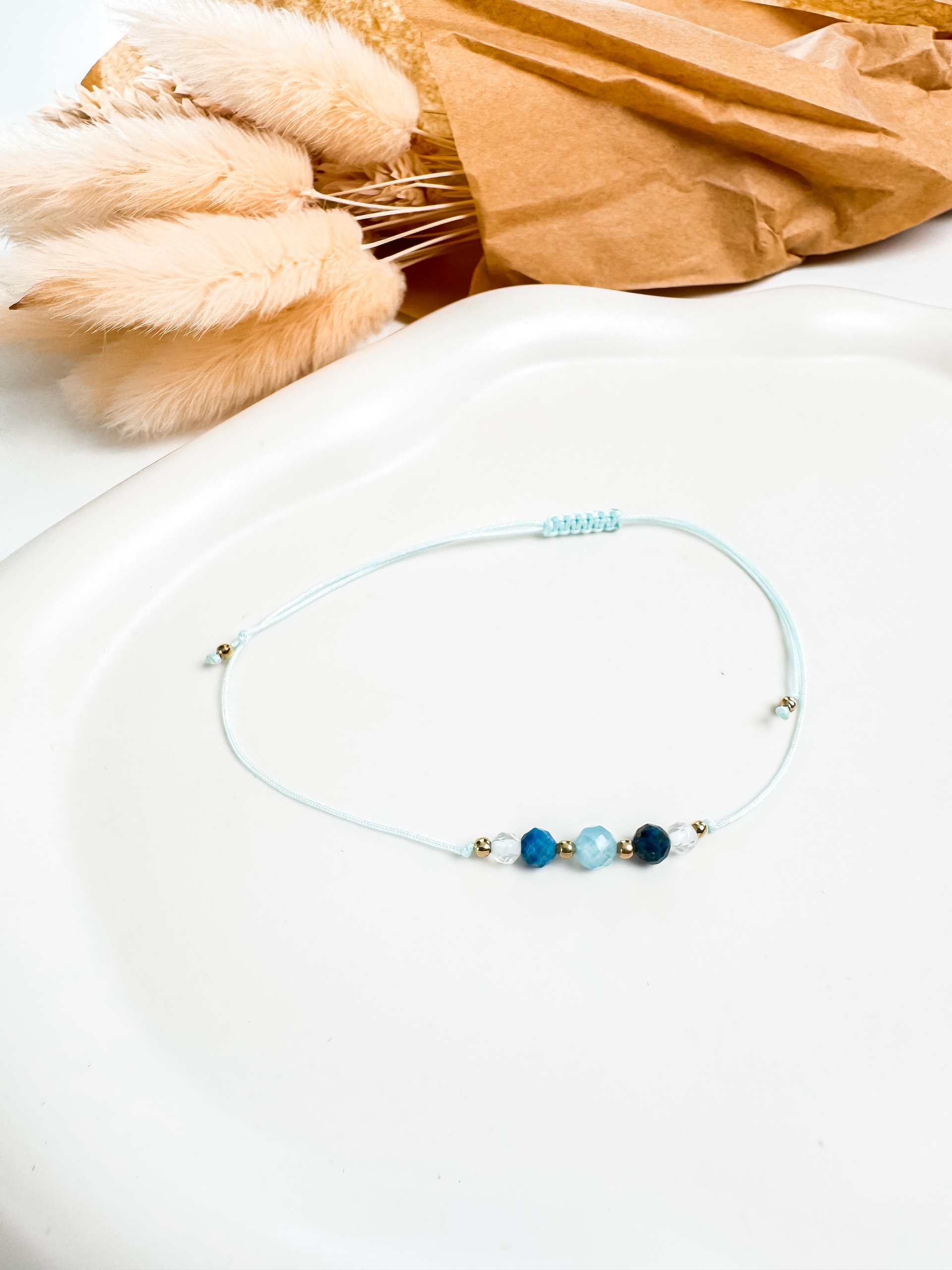 Bransoletka wykonana jest na błękitnym sznurku makramowym z regulowanym, plecionym zapięciem, dzięki czemu pasuje na każdy nadgarstek. Nawleczone są na nim kamienie fasetowane czyli kulki o ściętych bokach jeden 5mm akwamaryn, dwa 4mm lapisy lazuli, dwa 4mm kryształy górskie.  Minimalistyczny design sprawia, że doskonale komponuje się z każdą stylizacją, dodając jej elegancji i tajemniczej energii. Ozdobiona jest dodatkowo  kulkami ze stali chirurgicznej w kolorze złotym.