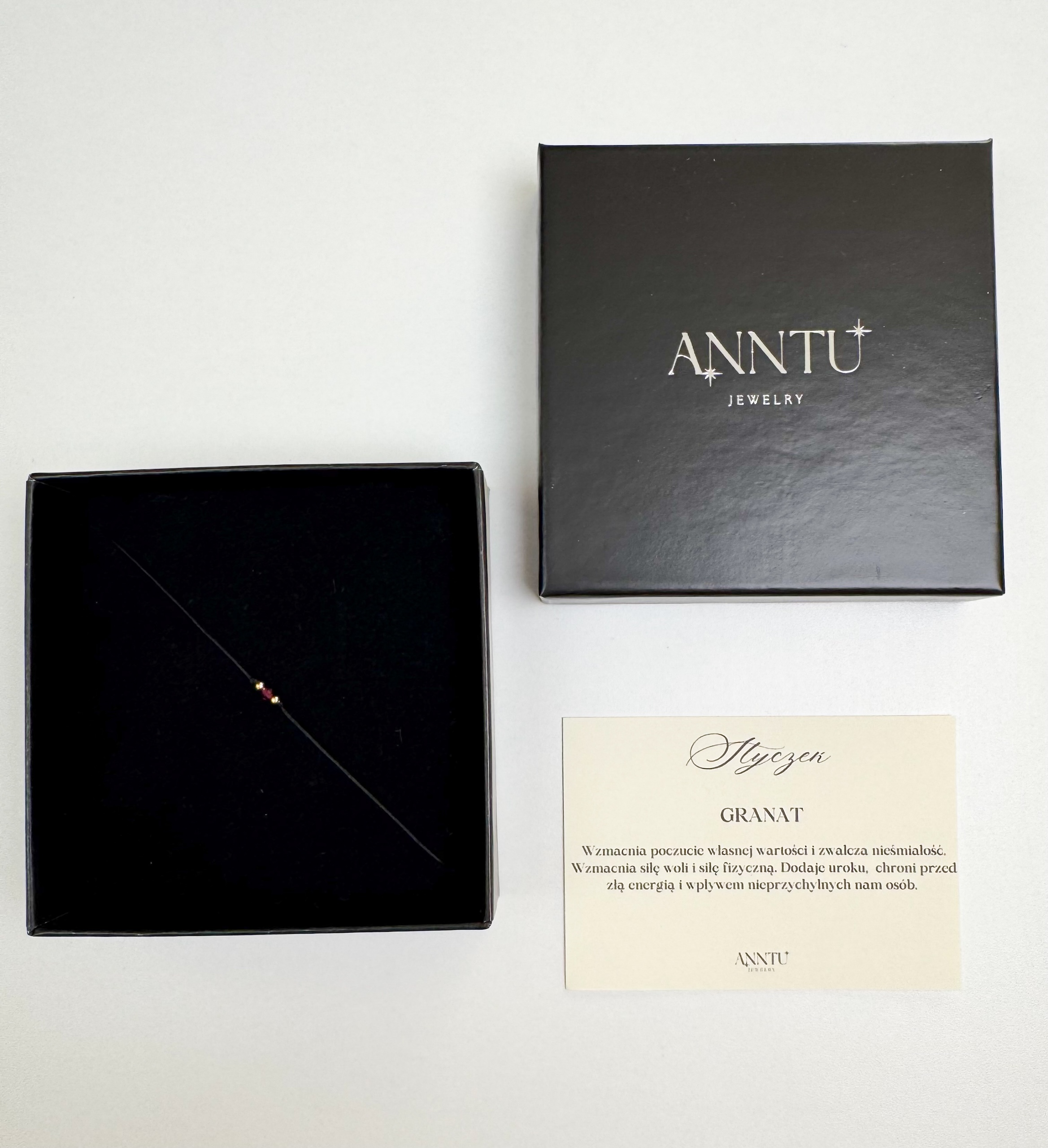 Bransoletka urodzinowa dla urodzonych w Styczniu z 3mm Granatem. Została ręcznie wykonana na czarnym, makramowym sznurku, z regulowanym zapięciem, co zapewnia komfort noszenia i idealne dopasowanie do nadgarstka. Ozdobiona jest dodatkowo 4 kulkami ze stali chirurgicznej w kolorze złotym.